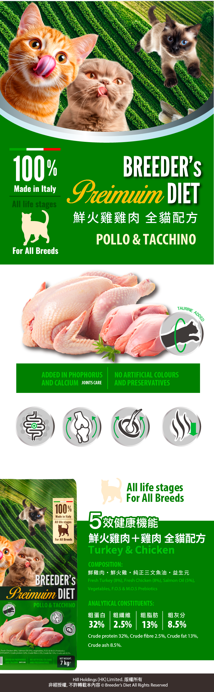 【2包優惠】Breeder’s Diet | 5效健康機能 鮮火雞肉+雞肉 全貓配方 7kg (BSC-1316)