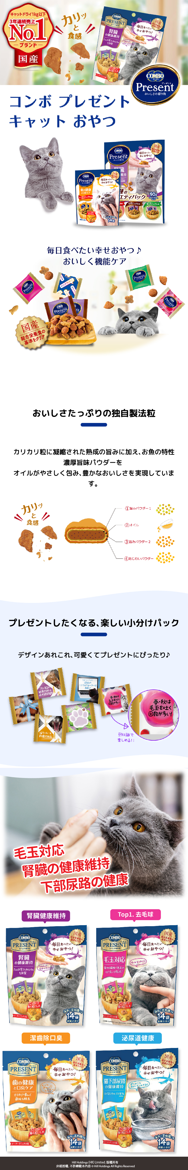 一種乾的零食粒,貓咪透過嚼碎以去除牙菌斑,並有益於牙齒健康和清除口臭。包含Glovigen PG。低鎂設計可讓貓的下尿道保持健康。 (鎂含量0.08%:標準值)。海鮮混合風味十足。含有蛋氨酸。 考慮到維持胃部的健康,含有會增加腸道中有益細菌的低聚醣。 獨立包裝,方便衞生