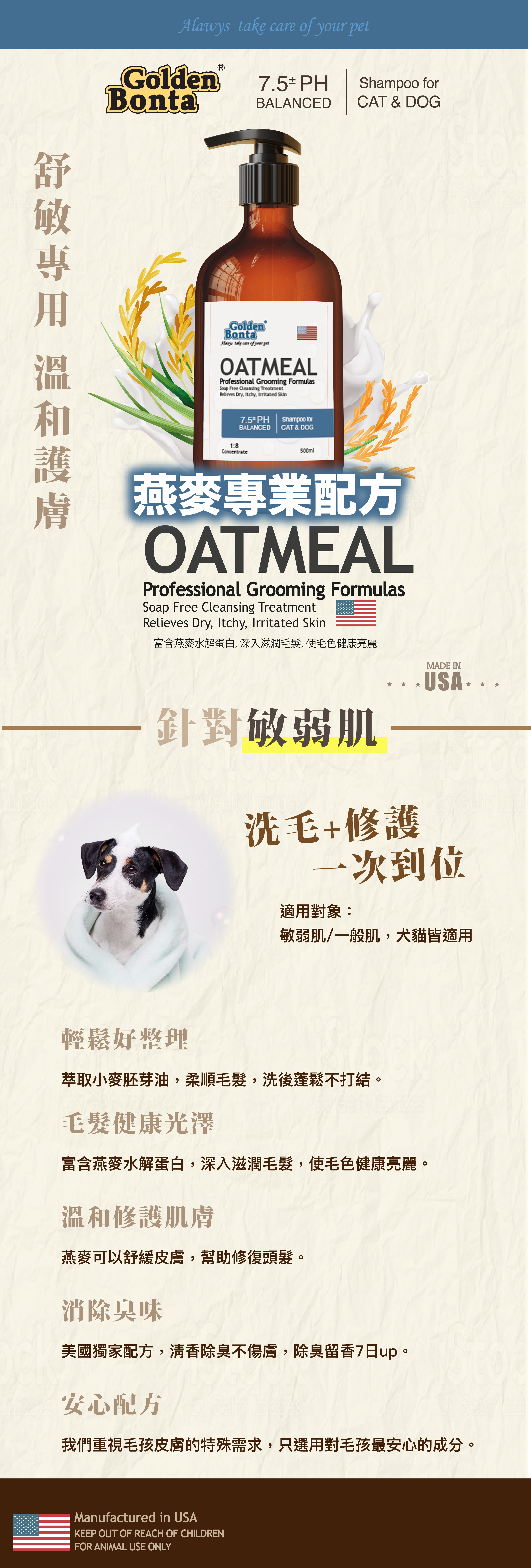 富含燕麥水解蛋白,深入滋潤毛髮,使毛色健康亮麗。