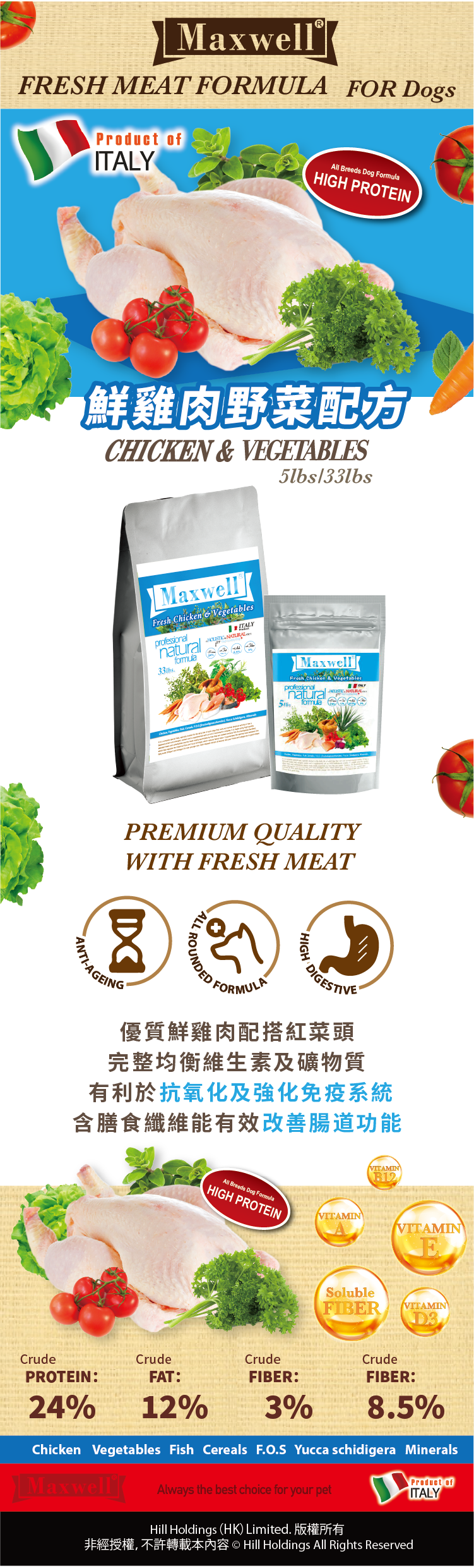 【 2包割引 】 Maxwell®丨Chicken & Vegetables 鮮雞肉加菜狗糧 33lbs (MXA-04)