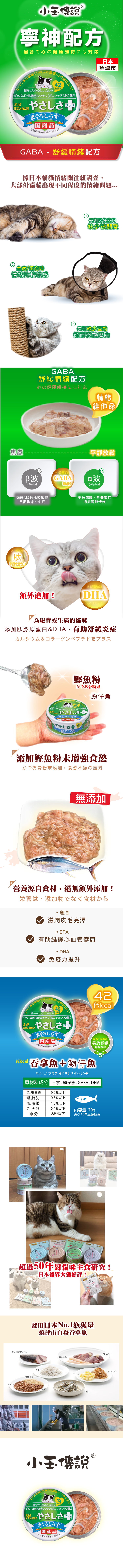 「寧神系列」專為【 情緒緊張及食慾不振 】貓咪而設, 據日本貓貓情緒關注組調查, 大部份貓貓出現不同程度的情緒問題... 特別添加GABA(情緒舒緩維他命)使普遍容易焦慮&失眠貓咪調節情緒起伏及改善睡眠品質 ! 為應對食慾不振問題,添加原鰹魚粉末,增強食慾!更將質感柔軟稠密,利於食慾不振貓咪吞嚥,水分高達至88%,無須額外加水使其口感變淡!全面照顧其貓咪需要!!
