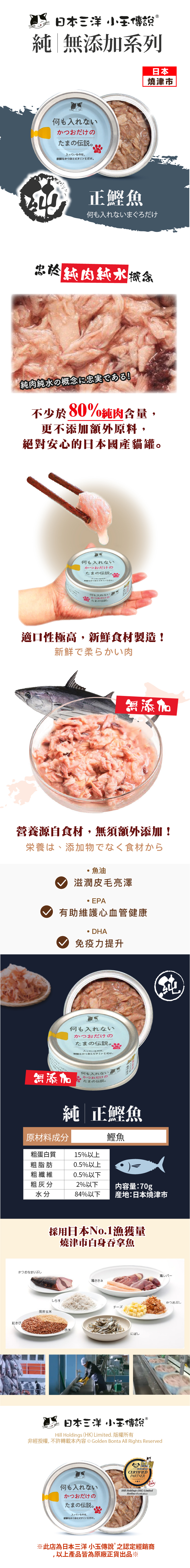 純系列「鰹魚 70g」使用了大量新鮮的鰹魚 ,並以毋添加任何增味湯汁方式製成貓罐。忠於純肉純水概念,啖啖肉絲之外,更讓貓貓吸收每日足夠營養!