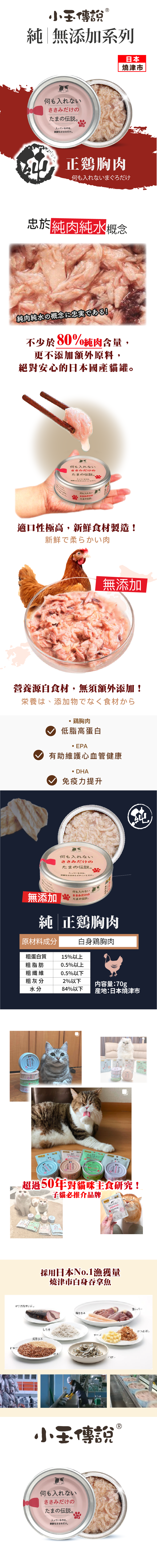 純系列雞胸肉 「70g」使用了大量鮮嫩的雞胸肉肉,並以毋添加任何增味湯汁方式製成貓罐。忠於純肉純水概念,啖啖肉絲之外,更讓貓貓吸收每日足夠營養!
