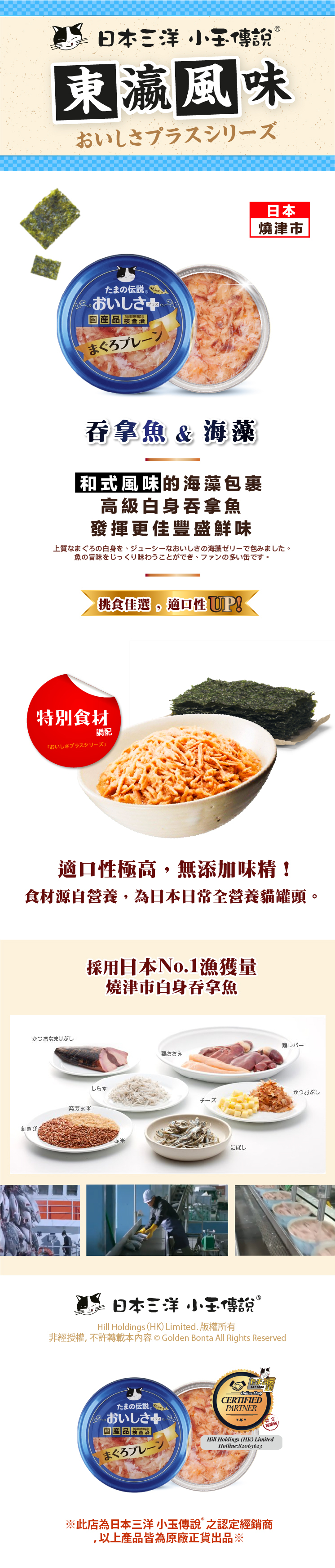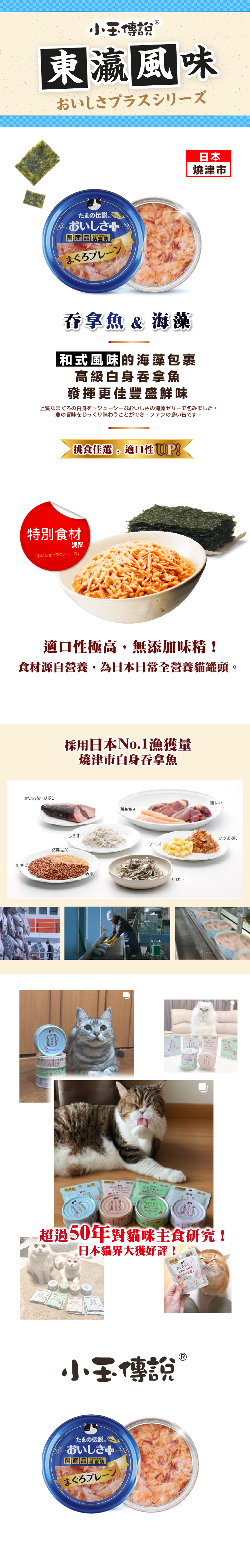 東瀛風味系列專為【 挑食貓咪 】而設,是以日本No.1漁獲量的燒津市🇯🇵白身吞拿魚為基礎,再分別加入海藻、芝士、沙甸魚及雞胸肉來增加罐頭風味,適口性大大提升!!