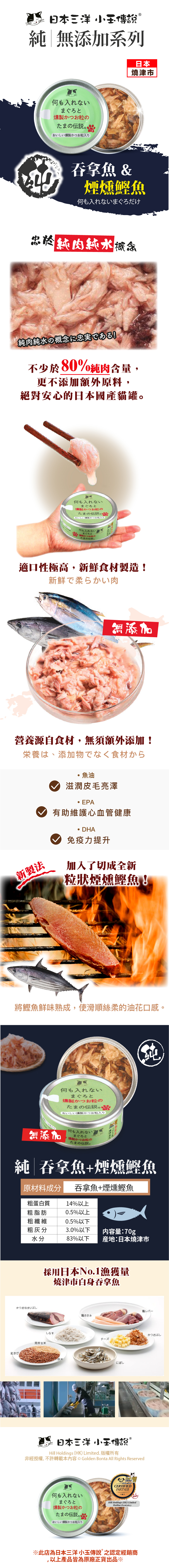 人氣的純系列推出「純無添加吞拿魚+煙燻鰹魚」中加入了切成全新粒狀熏制鰹魚,將鰹魚鮮味熟成,使滑順絲柔的油花口感,帶著點煙燻的風味與鹹味。