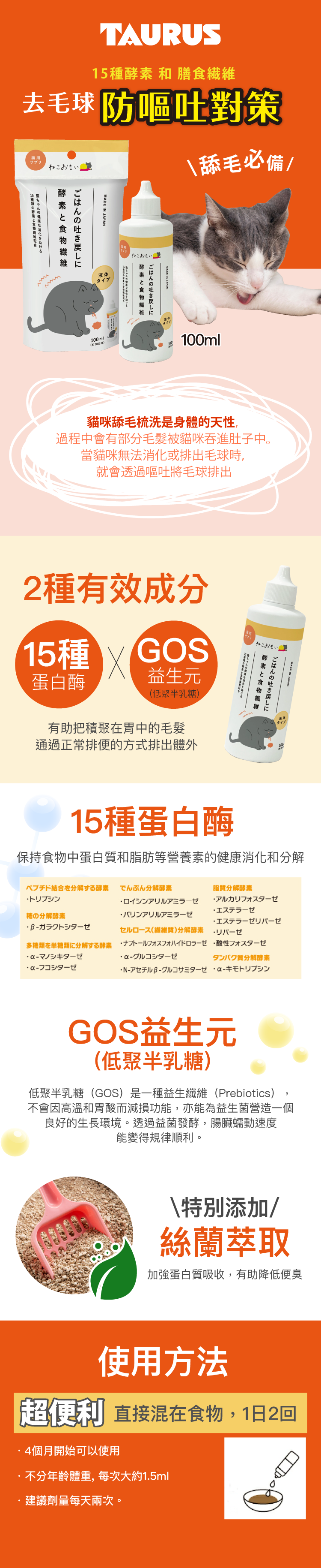 將產品直接混於日常食物中餵飼,主要利用膳食纖維於體內產生的15種酵素來梳理體內積聚的毛球,並促使適當地排泄出體外。